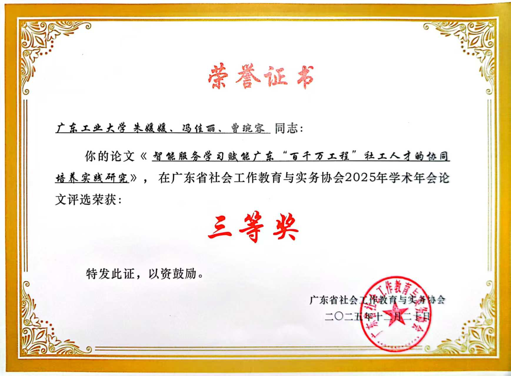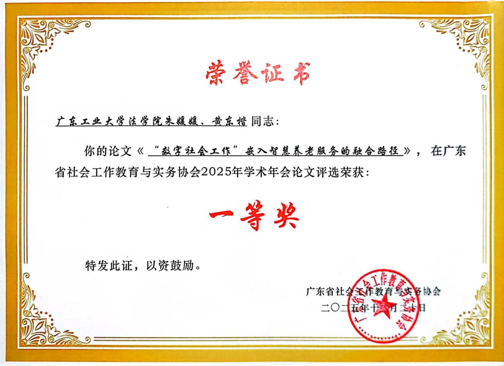 本次年会设置六个平行分论坛,涵盖司法社会工作、学校与儿童青少年社会工作、医务社会工作等多个领域,吸引了全省高校、社工机构300余名专家学者、实务工作者及学生代表参与。我院社会工作专业研究生黄东楷、冯佳丽、曾琬容在年会论文评选中分别荣获一等奖和三等奖,24级非全日制社会工作研究生赵广梅荣获三等奖。